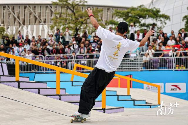 11月11日下午,十五運會滑板項目男子街式決賽,廣東隊潘家杰完成高難度動作后展開雙臂與歡呼的觀眾們互動。鄭新洽 攝ZmU速刷資訊——每天刷點最新資訊,了解這個世界多一點SUSHUAPOS.COM
