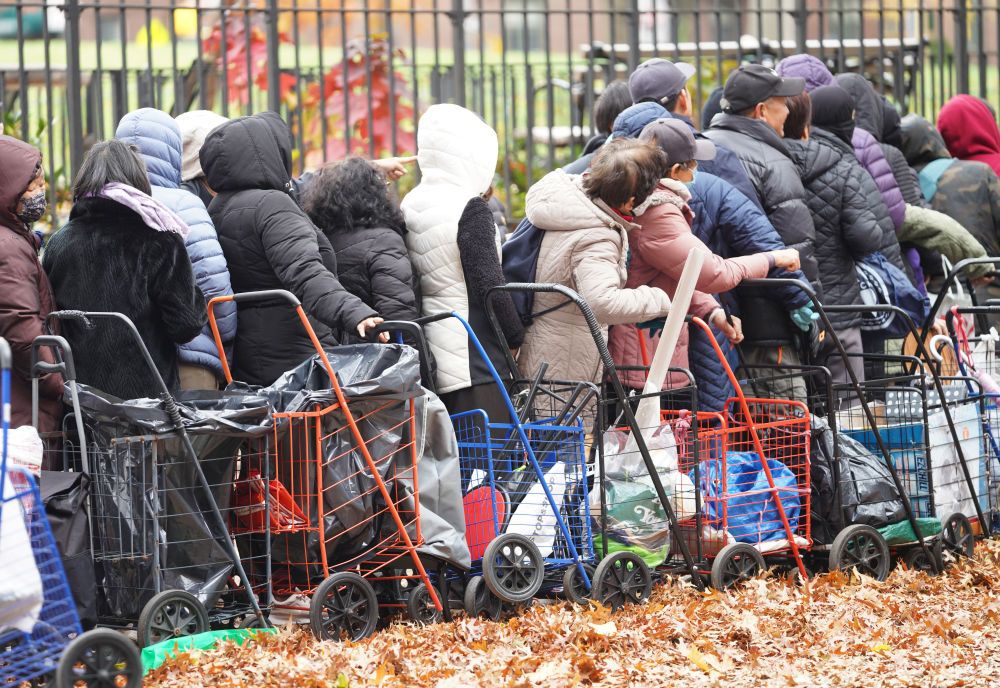 11月12日,人們在美國紐約一處食物發(fā)放點等待領(lǐng)取食物。新華社記者張鳳國攝