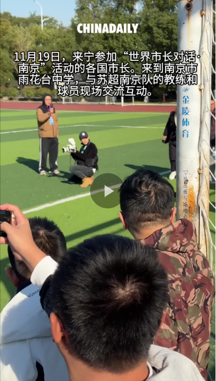 11月19日,參加“世界市長對話·南京”活動的各國市長。來到南京市雨花臺中學,與“蘇超”南京隊員、教練互動交流,觀摩青少年足球訓練,感受城市青春活力。到訪市長和代表們現場參與互動,體驗了“點球大戰”等環節。德國迪特福特市市長Bernd Mayr在現場表示,足球能夠成為不同城市間文化交流的重要渠道之一。(中國日報江蘇記者站 記者 蒼微)