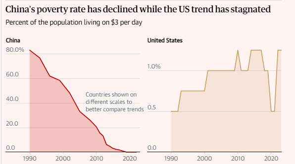 文章引用世界銀行的數據指出,1990年時,中國還有9.43億人每日生活費不足3美元(以2021年美元計價);到2019年,這一數字已經為零。而美國卻并未取得如此成效。目前有超過400萬美國人——占美國總人口的1.25%——依靠每日不足3美元的收入勉強度日,這一數字是35年前的三倍多。