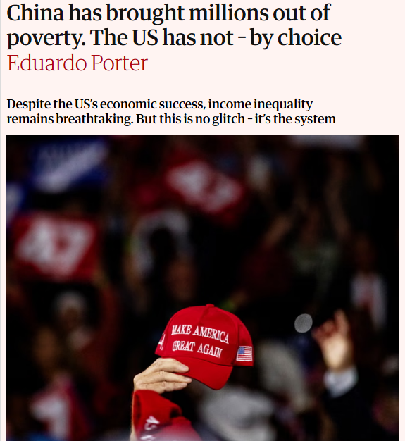 《衛報》認為,一個社會的成功程度取決于這個社會如何使用自身創造的財富,以及如何分擔失敗帶來的成本。與中國不同,美國并未向在貧困線邊緣勉強度日的人群提供太多幫扶。盡管美國的人均經濟產出高于中國,但美國的赤貧人口數量卻超過中國,這其中原因并非經濟能力不足,而是政策選擇不同。
