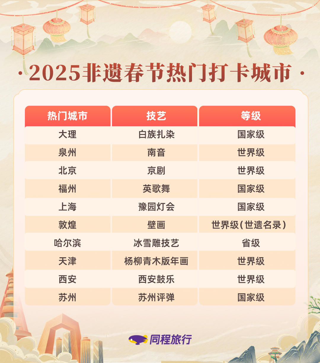 2025年巳蛇春節(jié)已近,中國“非遺”年味愈發(fā)濃厚。1月25日,同程旅行正式發(fā)布《2025非遺春節(jié)旅行地圖》(以下簡稱《地圖》)。作為行業(yè)首個非遺春節(jié)旅行地圖,同程旅行結(jié)合平臺數(shù)據(jù),分析非遺旅行趨勢及全國熱門非遺主題和打卡地。隨著首個非遺春節(jié)的到來,中國文旅市場預(yù)計將迎來一場非遺文化的打卡狂歡。